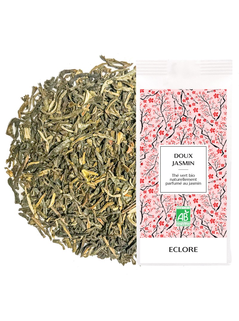 Ce thé vert au jasmin bio est issu de la rencontre d'un thé vert de Chine bio sans amertume et de fleurs de jasmin fraîches issues de l'agriculture biologique. Mis en présence des fleurs de jasmin pendant plusieurs jours et plusieurs nuits, il en a absorbé tous les arômes. Cette méthode de parfumage est une méthode issue du savoir-faire traditionnel chinois appelée "enfleurage". D'une extrême douceur, notre thé vert au jasmin bio Doux Jasmin restitue dans votre tasse toutes les notes délicates et fleuries du jasmin.